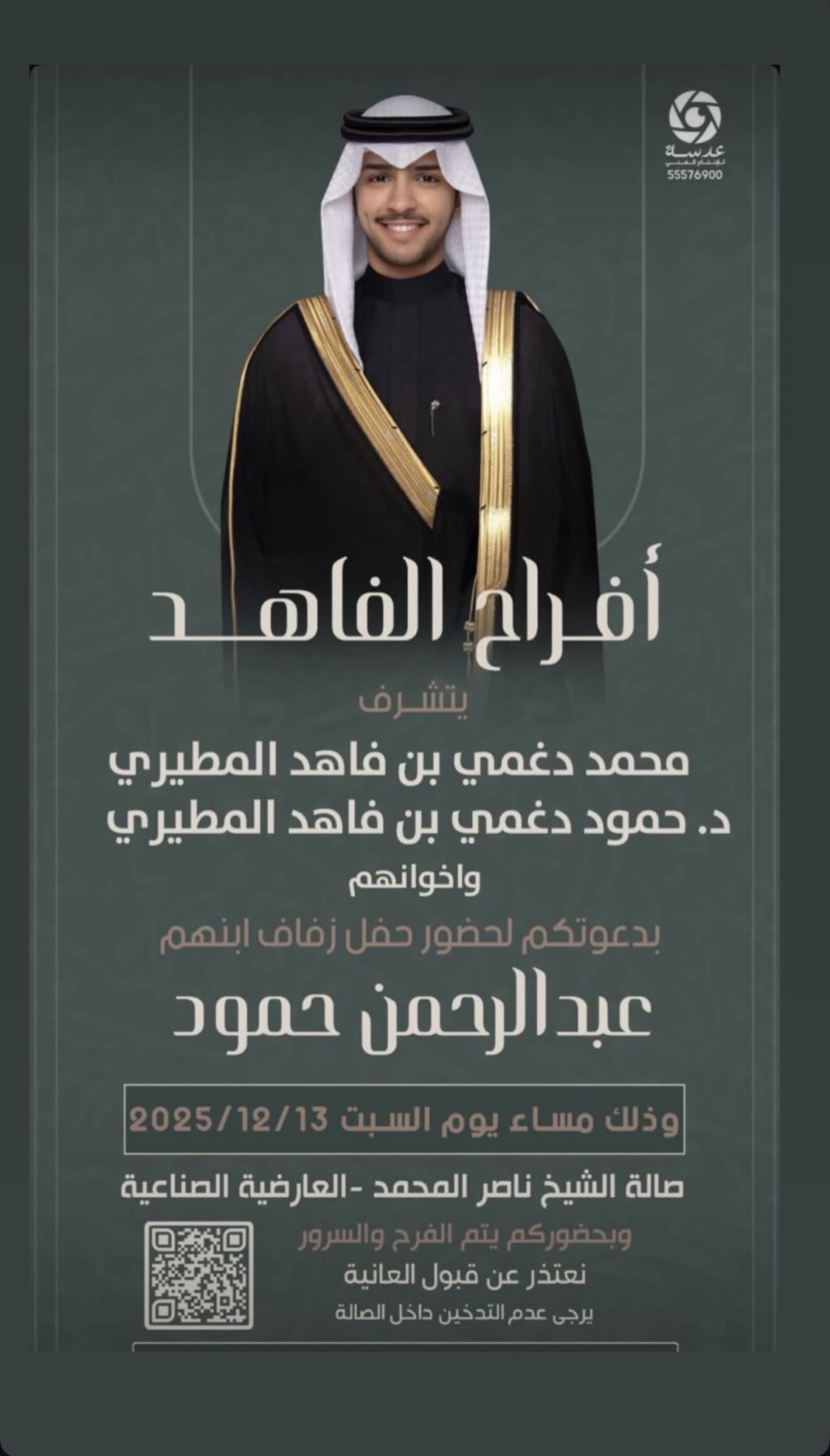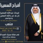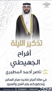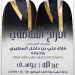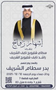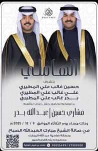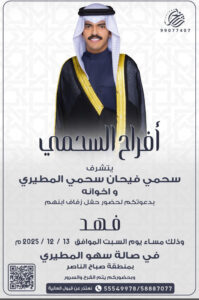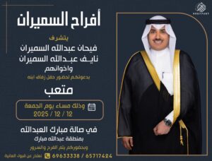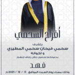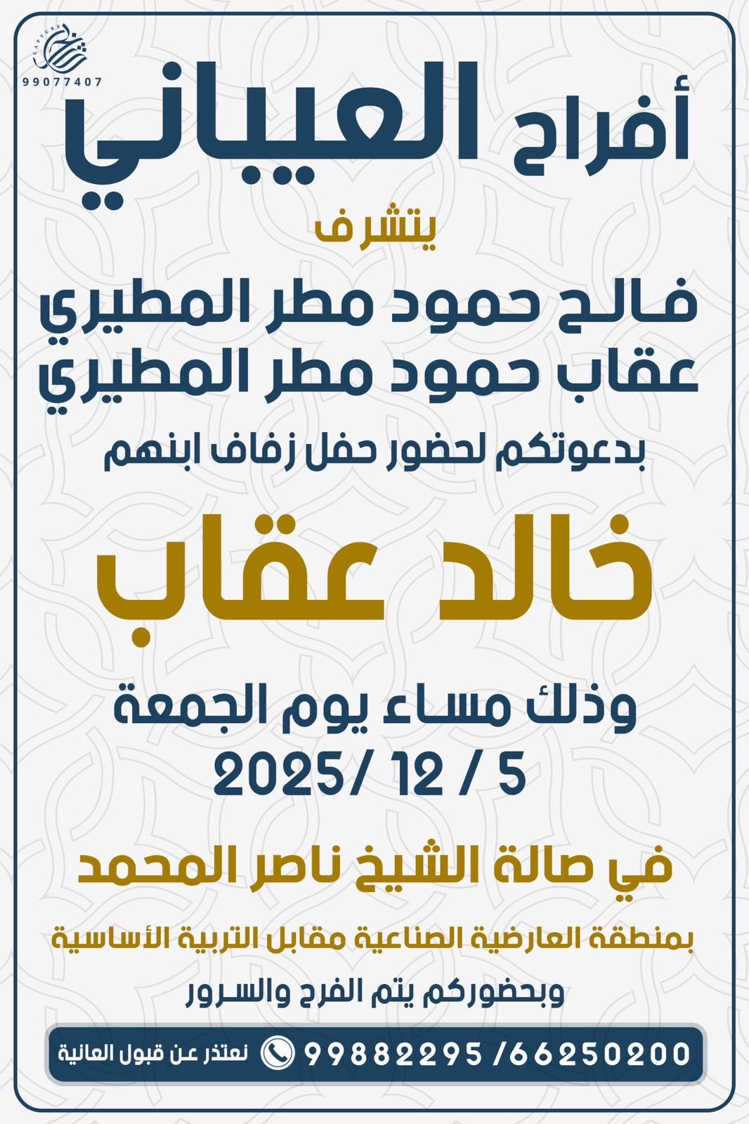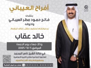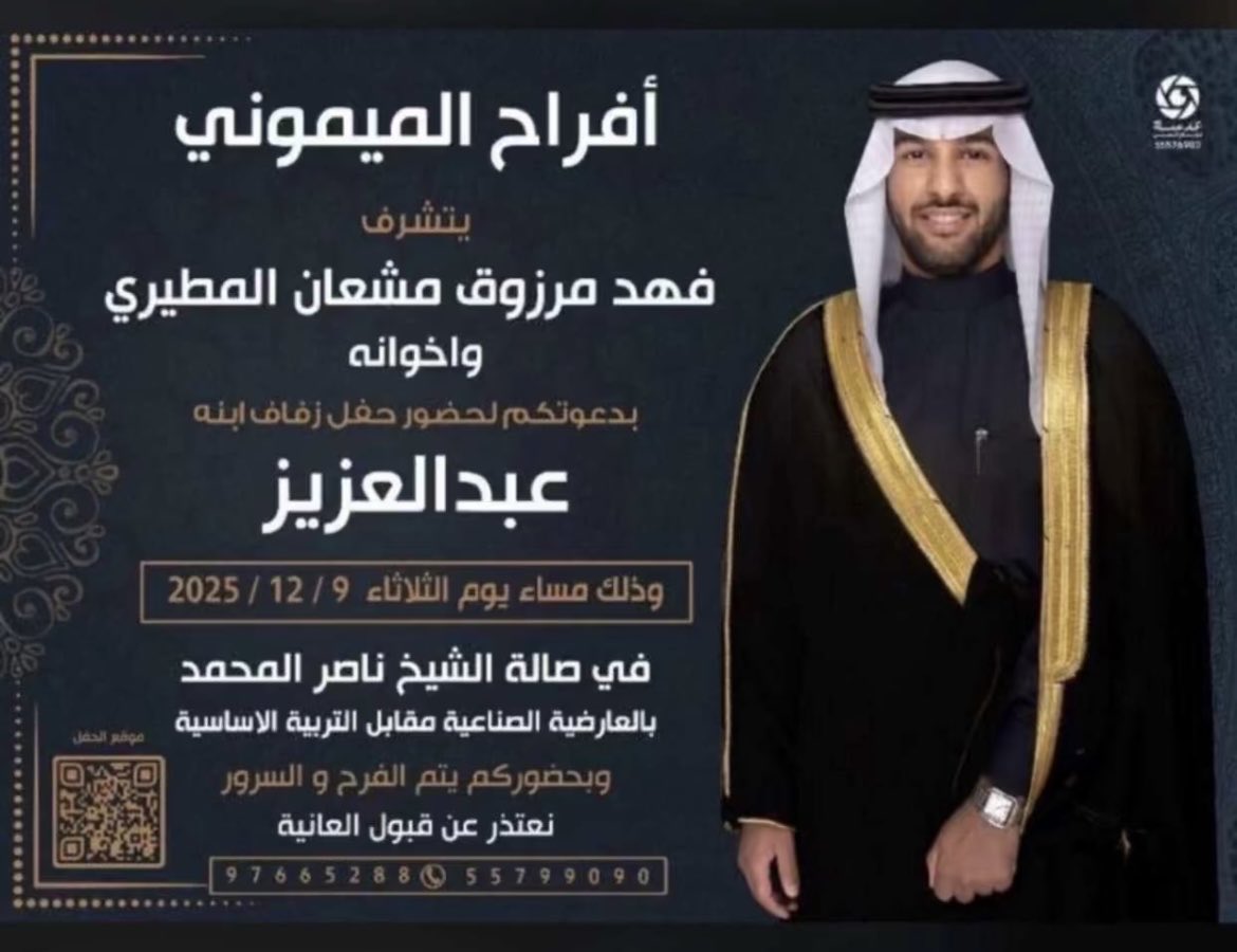 يتشرففالح حمود مطر العيباني الميمونيواخوانهبدعوتكم لحضور حفل زفاف ابنهمخالد عقابمساء يوم الجمعه2025/12/5