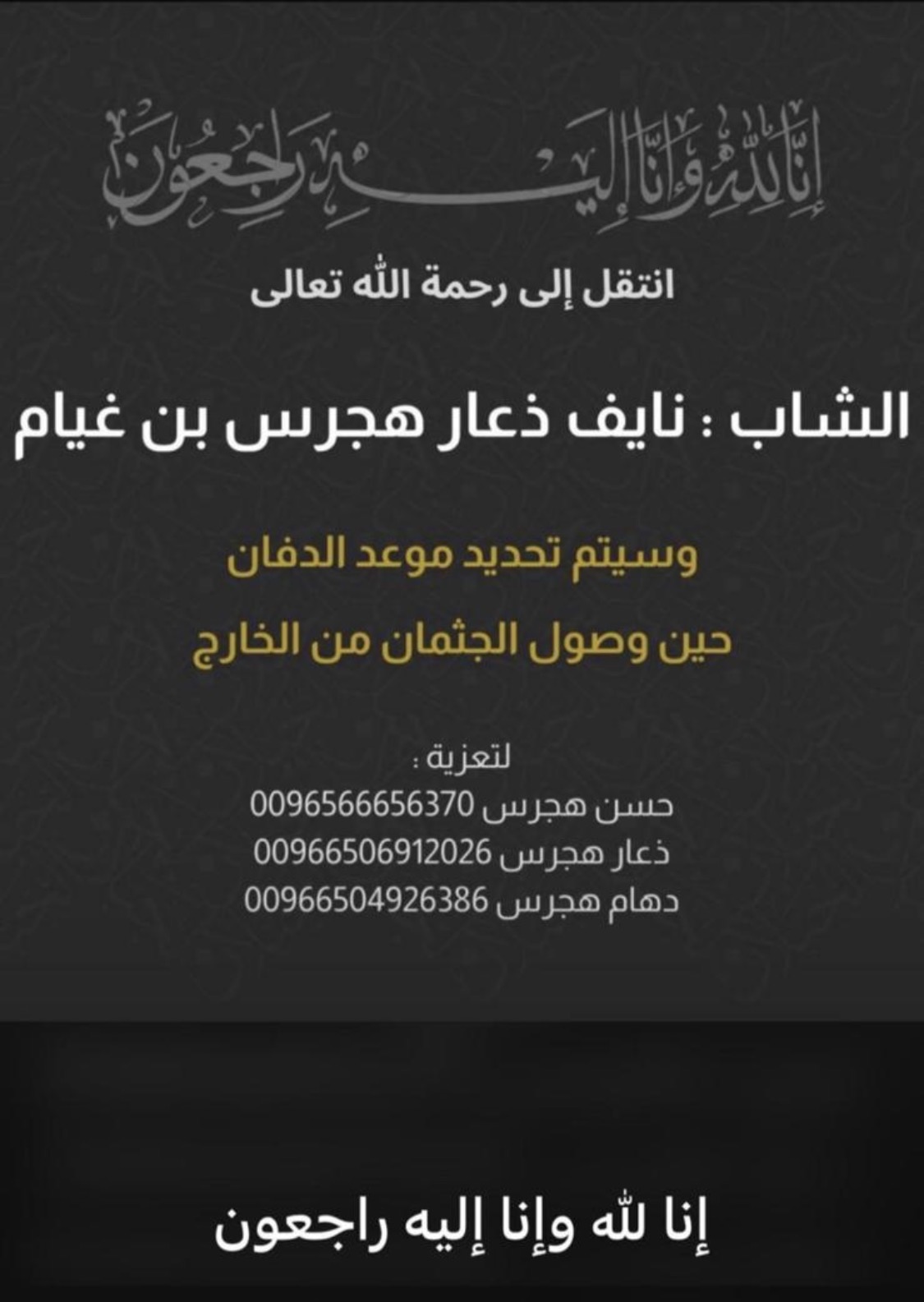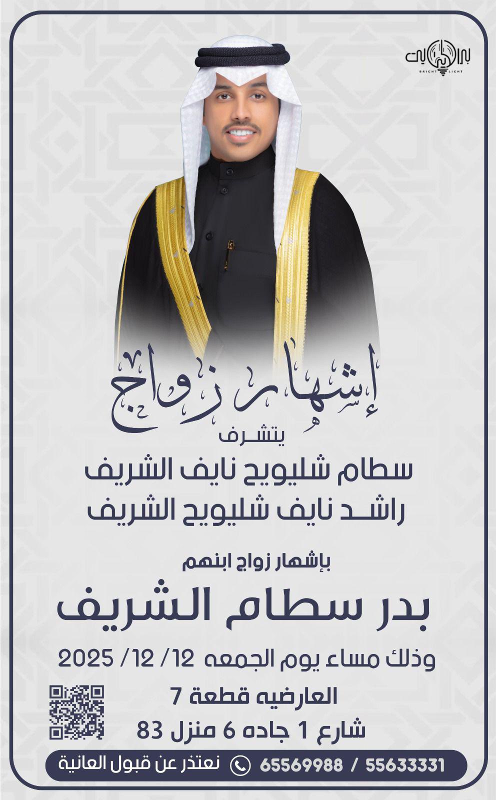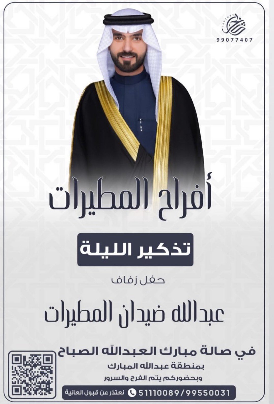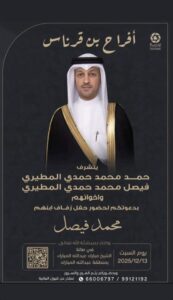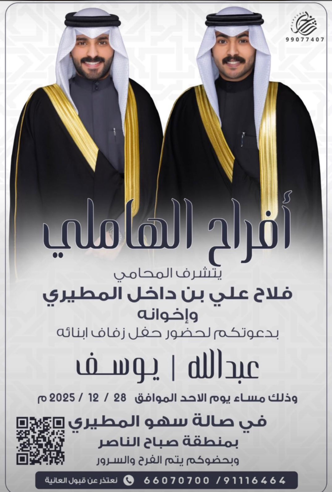 يتشرففالح حمود مطر العيباني الميمونيواخوانهبدعوتكم لحضور حفل زفاف ابنهمخالد عقابمساء يوم الجمعه2025/12/5
