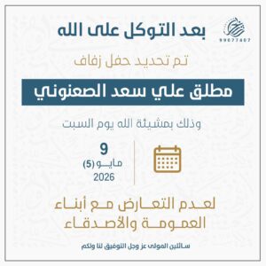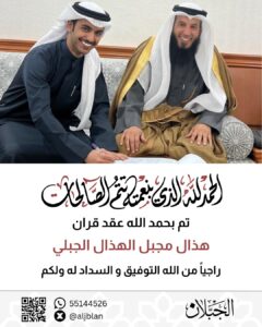 الحمدلله الذي تتم بنعمته الصالحاتتم بحمد الله عقد قران :( هذال مجبل الهذال الجبلي )راجياً…