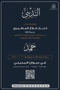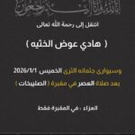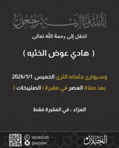 انتقل الى رحمة الله تعالى ( هادي عوض الخثيه ) وسيوارى جثمانه الثرى الخميس 2026/1/1بعد…