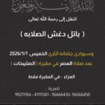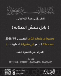 انتقل الى رحمة الله تعالى ( باتل دغش الصلابه ) وسيوارى جثمانه الثرىاليوم الخميس 2026/1/1بعد…