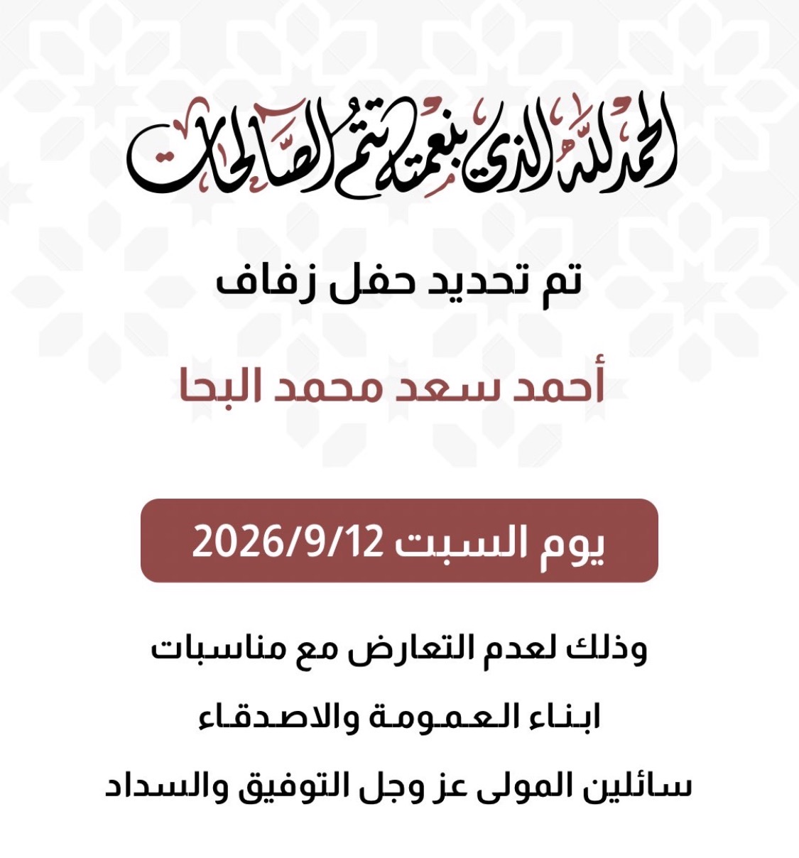 تم بحمد الله وفضله تحديد حفل زفاف أحمد سعد محمد البحا المطيري