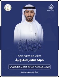 نبارك لابن العم :عبدالله سالم مقذل المطيريحصوله على عضوية جمعية صباح الناصر التعاونية