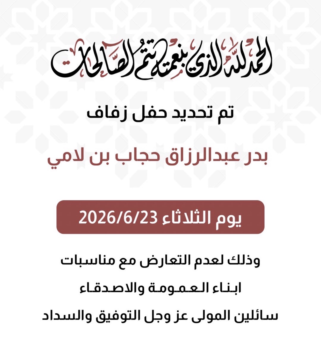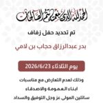 تم بحمد الله وفضله تحديد حفل زفاف بدر عبدالرزاقحجاب بن لامي