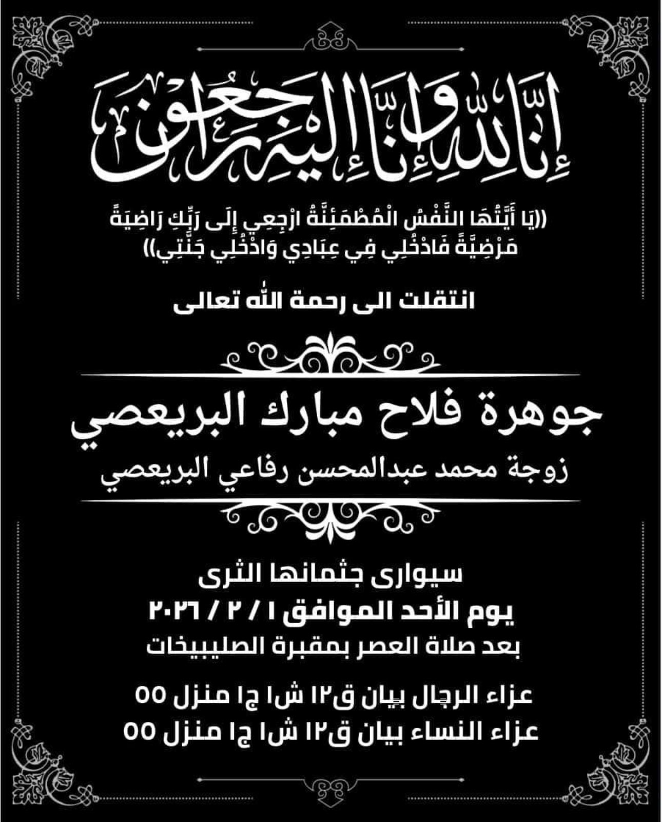 انتقلت الى رحمة الله تعالى ( جوهره فلاح مبارك البريعصي المطيري )زوجة : محمد عبدالمحسن…