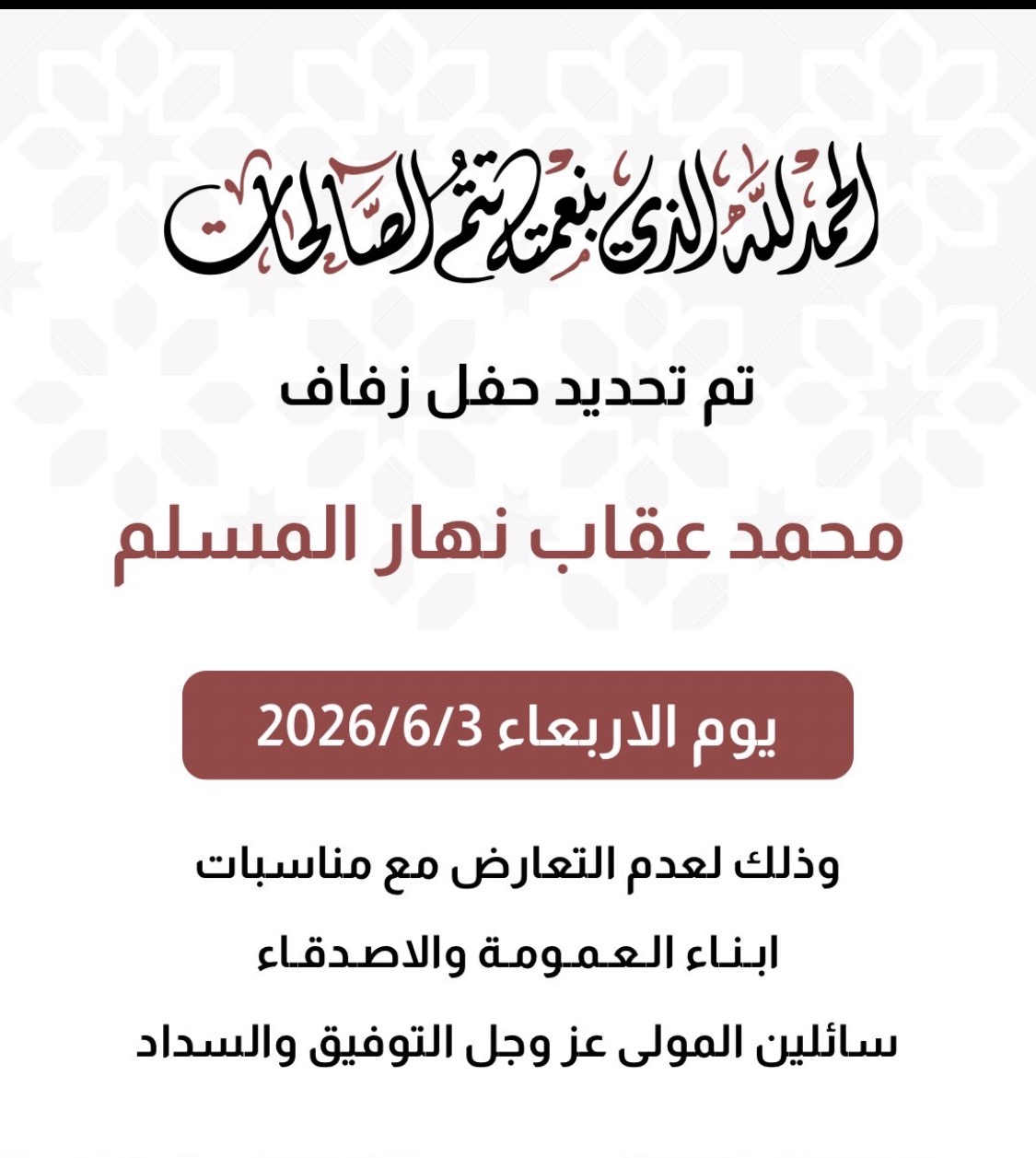 تم تحديد حفل زفاف محمد عقاب نهار المسلم المطيري
