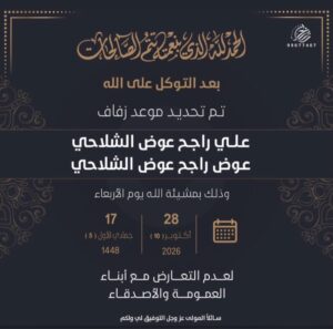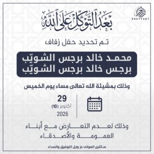 بعد التوكل على اللهتحديد حفل زفاف وذلك مساء يوم الخميسالموافق 29 / 10 / 2026…