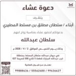 دعوة عشاء يتشرفأبناء / سلطان مطلق بن مسلط الصعنوني المطيريبدعوتكم لحضور عشاء بمناسبة زواج ابنهم…