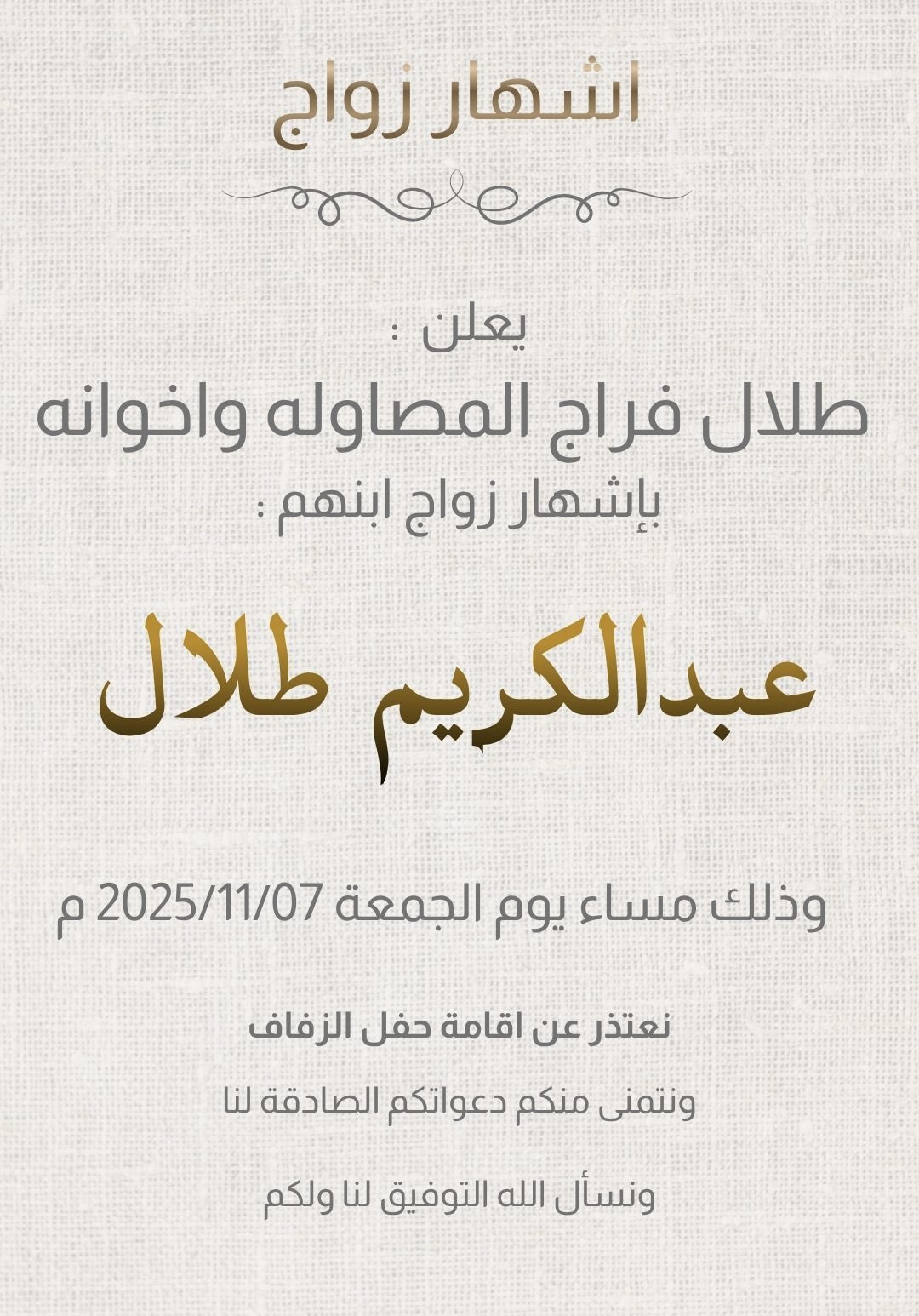 ‏نعتذر عن اقامة حفل الزفاف