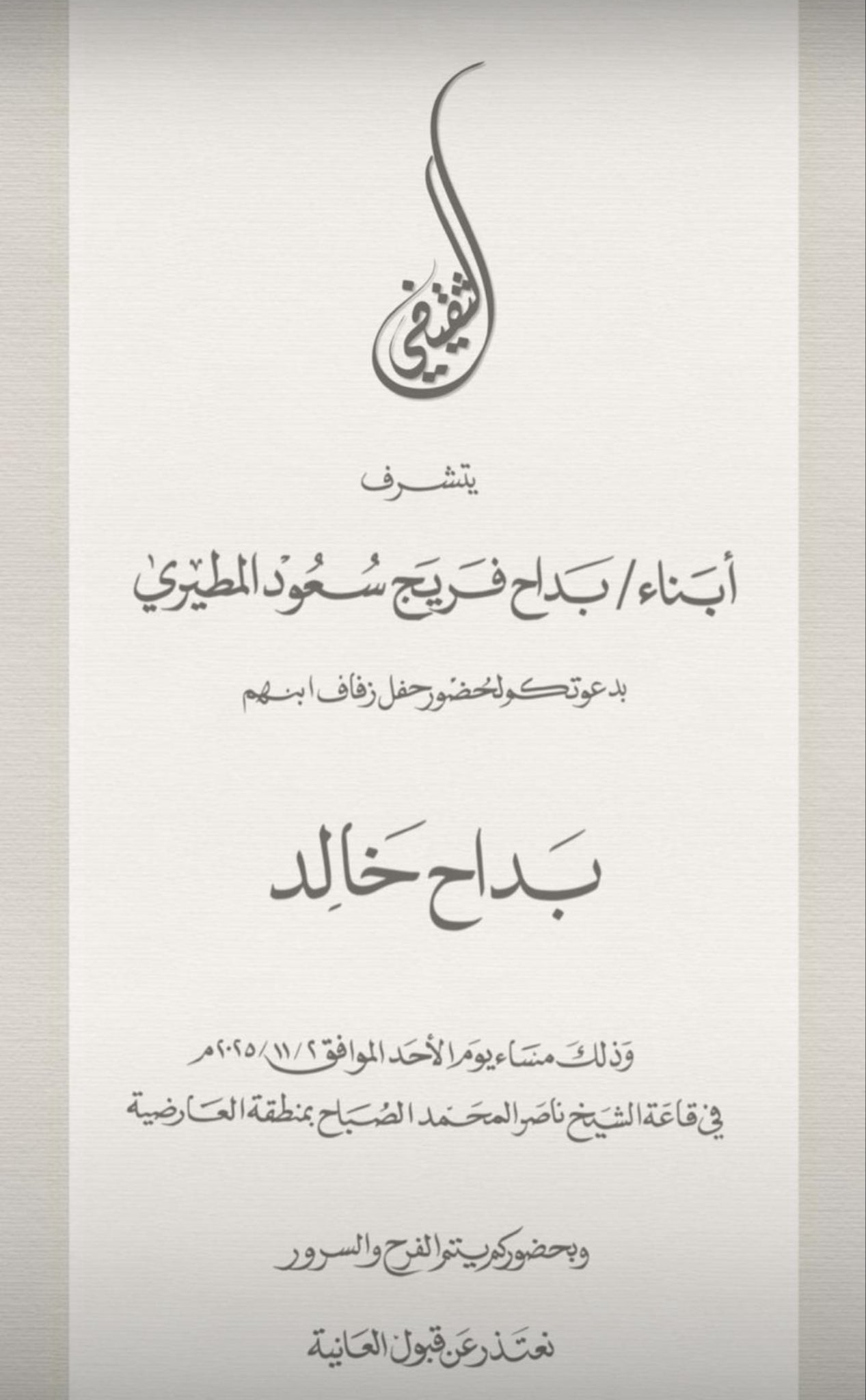 بدعوتكم لحضور حفل زفاف ابنهم :