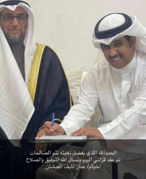 مناسبات Mutair 12/19/2025 0 تعليقات تم عقد قران نبارك لأبن العم / بدر محمد فهد الجدعي عقد قرانه أسأل الله أن يبارك لهما ويبارك عليهما ويجمع بينهما بخير