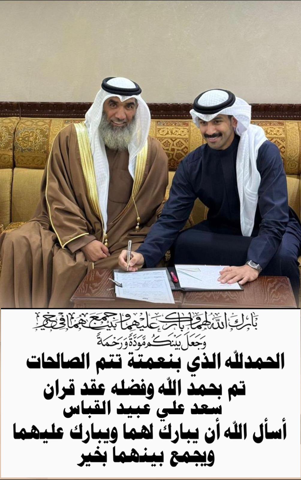 مناسبات Mutair 12/27/2025 0 تعليقات تم عقد قران نبارك لأبن العم / سعد علي عبيد القباس عقد قرانه أسأل الله أن يبارك لهما ويبارك عليهما ويجمع بينهما بخير