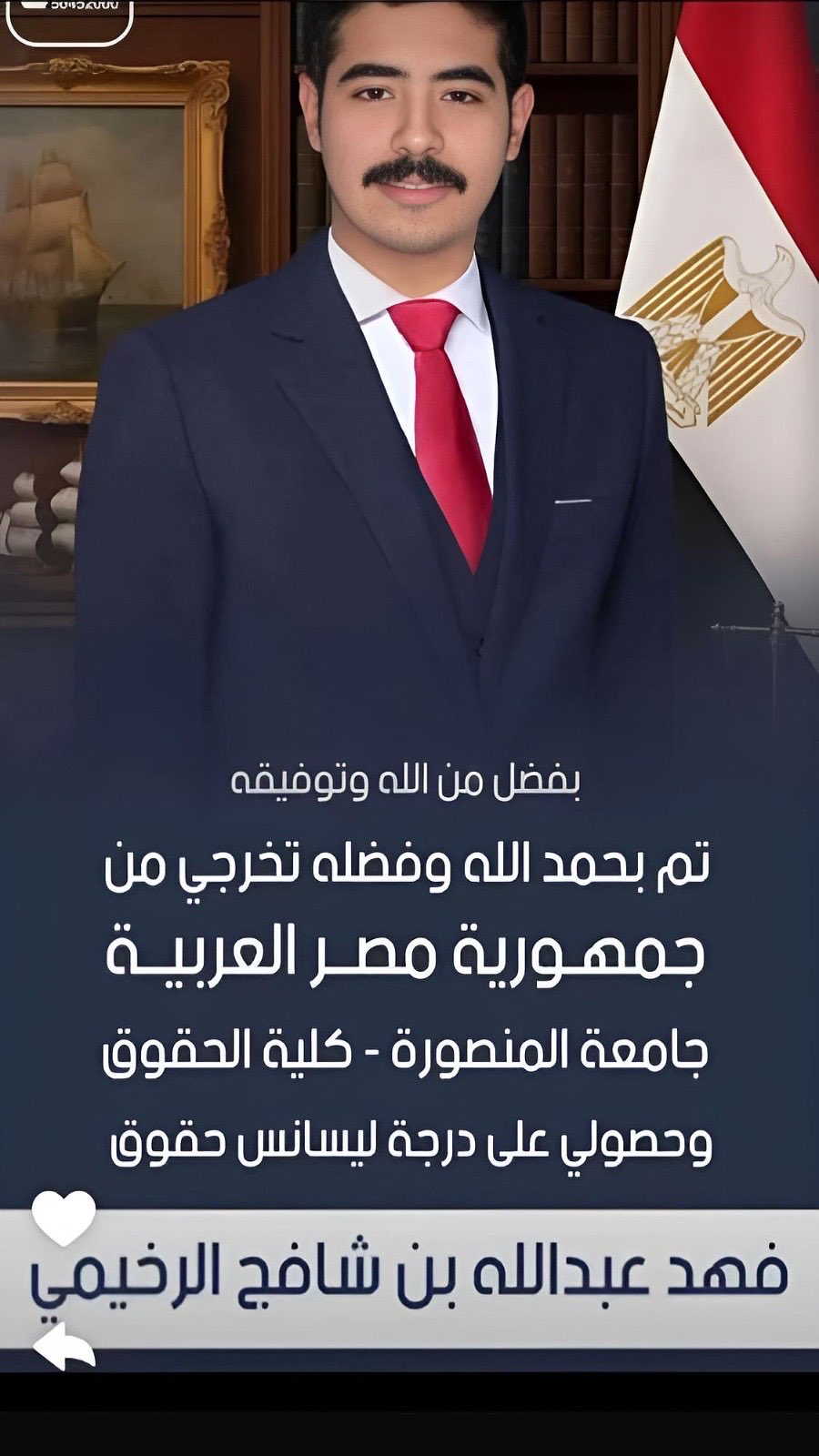نبارك لأبن العم / فهد عبدالله بن شافج الرخيمي تخرجه من جمهورية مصر العربية جامعة المنصورة – كلية الحقوق وحصوله علي درجة ليسانس حقوق أسأل الله له التوفيق والسداد