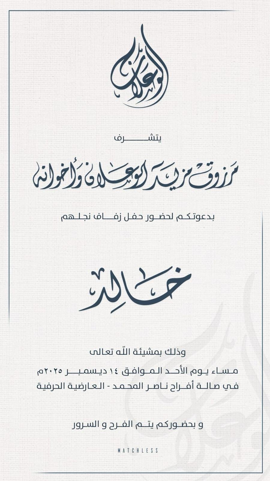 يتشرف مرزوق مزيد الوعلان واخوانه بدعوتكم لحضور حفل زفاف نجلهم خالد وذلك بمشيئة الله تعالى…