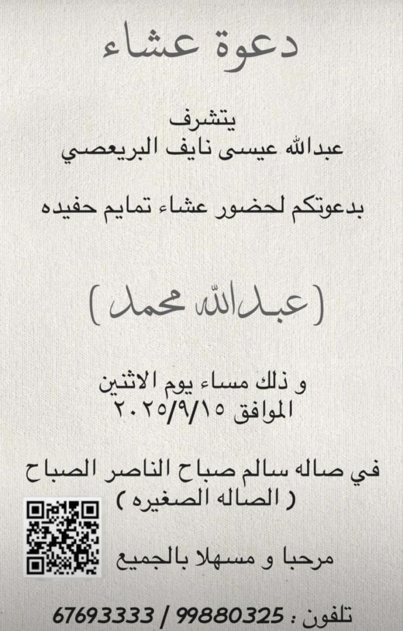 دعوة عشاء يتشرف :عبدالله عيسى نايف البريعصي المطيريبدعوتكم لحضور عشاء تمام حفيده : ( عبدالله…