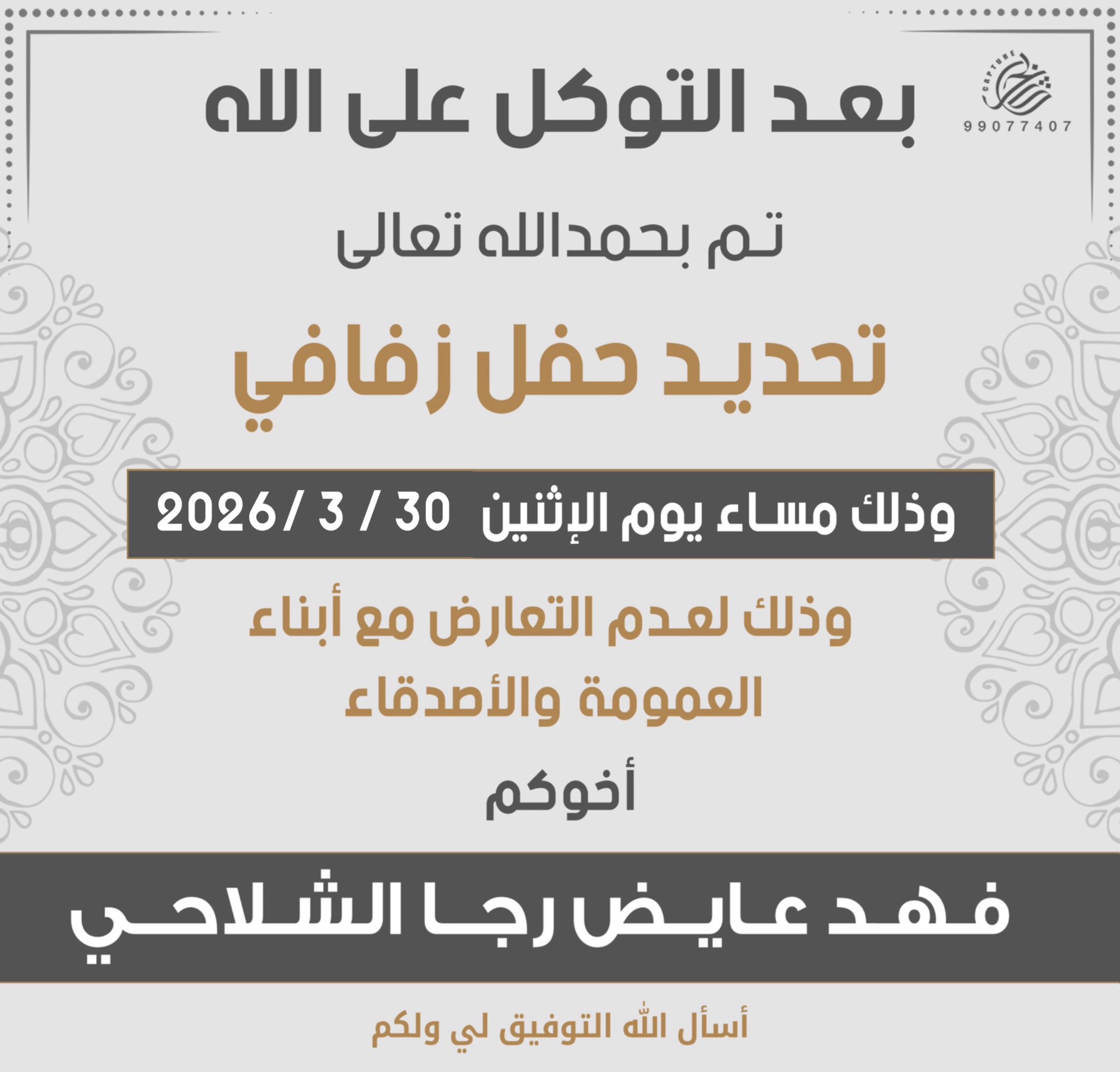 بعد التوكل على اللهتم تحديد حفل زفافي بمشيئة الله يوم الاثنينالموافق 30 / 3 /…