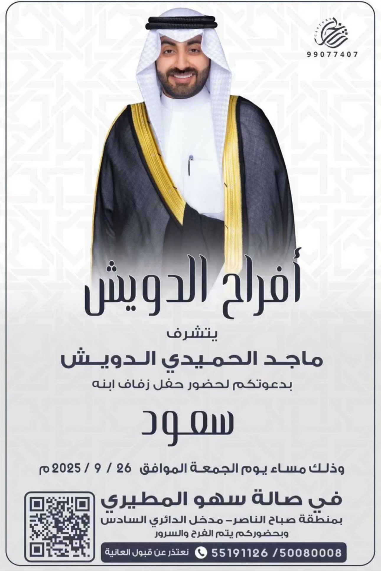 أفراح الدويش يتشرف :ماجد الحميدي الدويشبدعوتكم لحضور حفل زفاف ابنه : ( سعود ) وذلك…