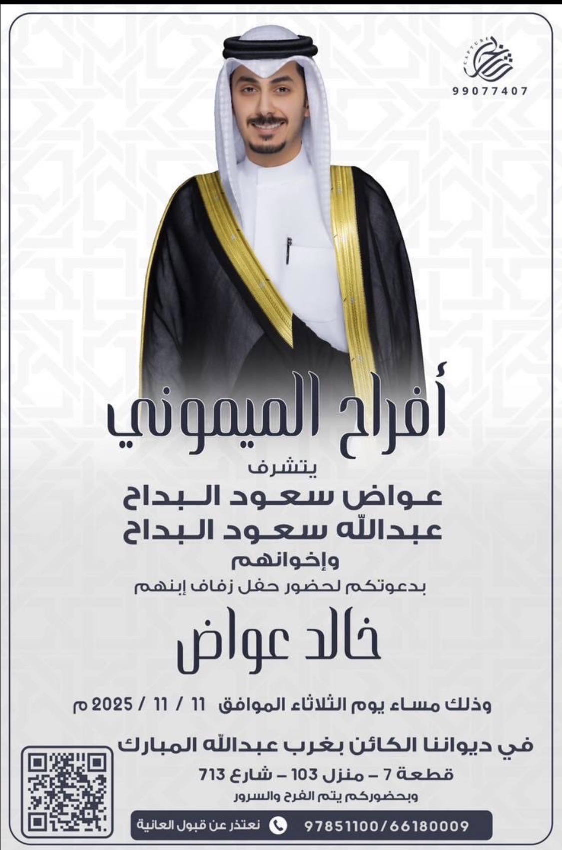 أفراح الصعنوني يتشرف :فهد محسن بن دعسان الصعنوني المطيريمشعل محسن بن دعسان المطيري وإخوانهبدعوتكم لحضور…