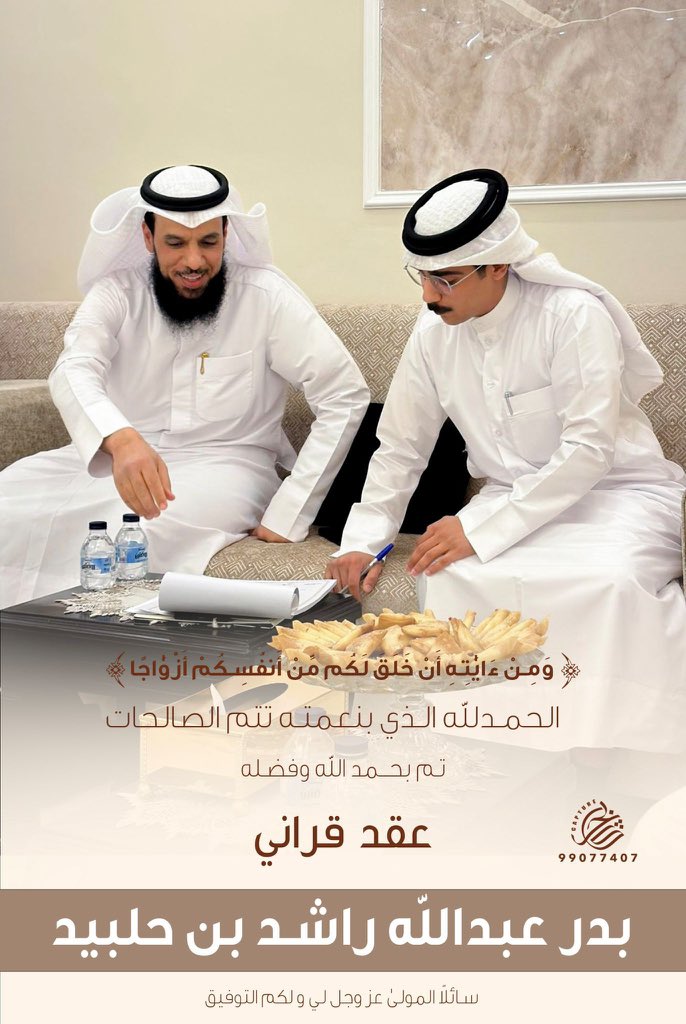 الحمدلله الذي تتم بنعمته الصالحاتتم بحمد الله عقد قران :( بدر عبدالله راشد بن حلبيد…