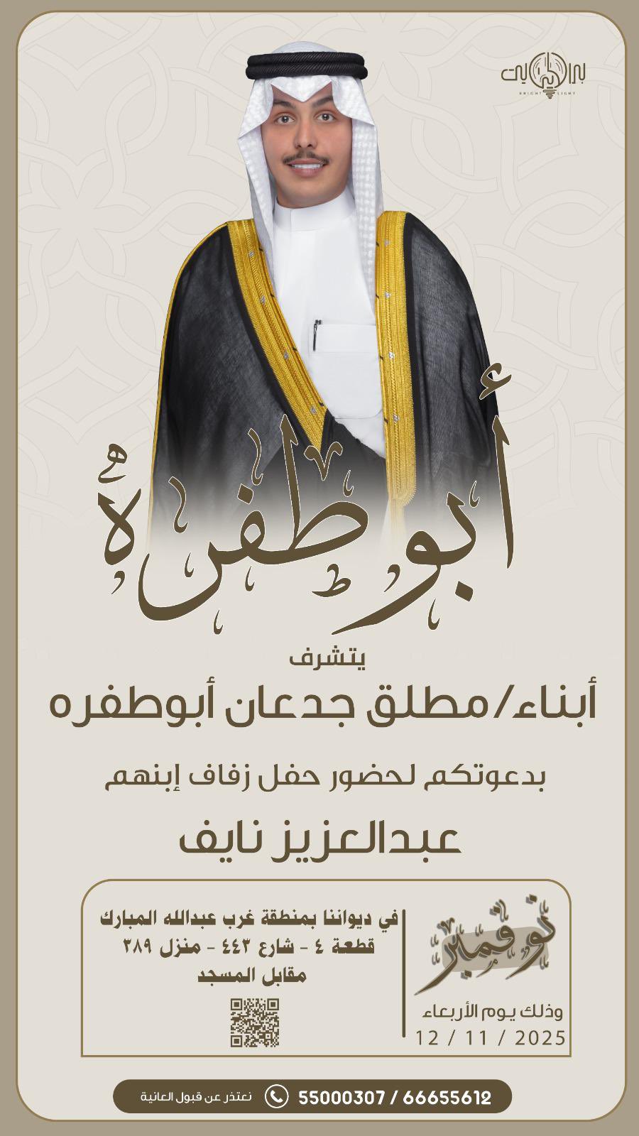 افراح ابوطفره يتشرف :ابناء / مطلق جدعان ابوطفرهبدعوتكم لحضور حفل زفاف ابنهم : ( عبدالعزيز…