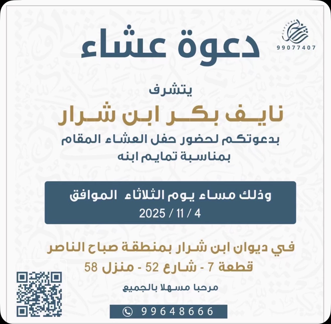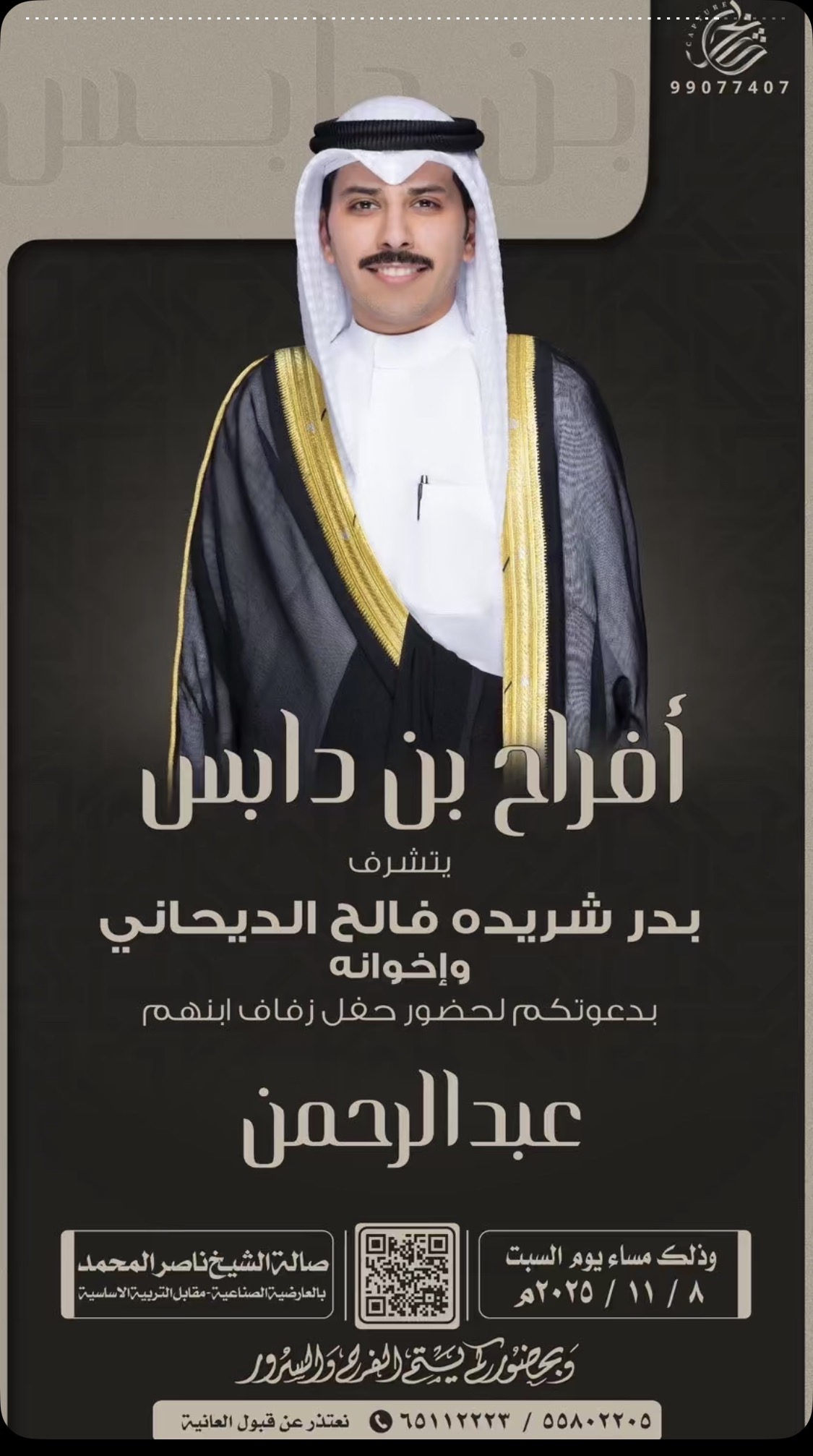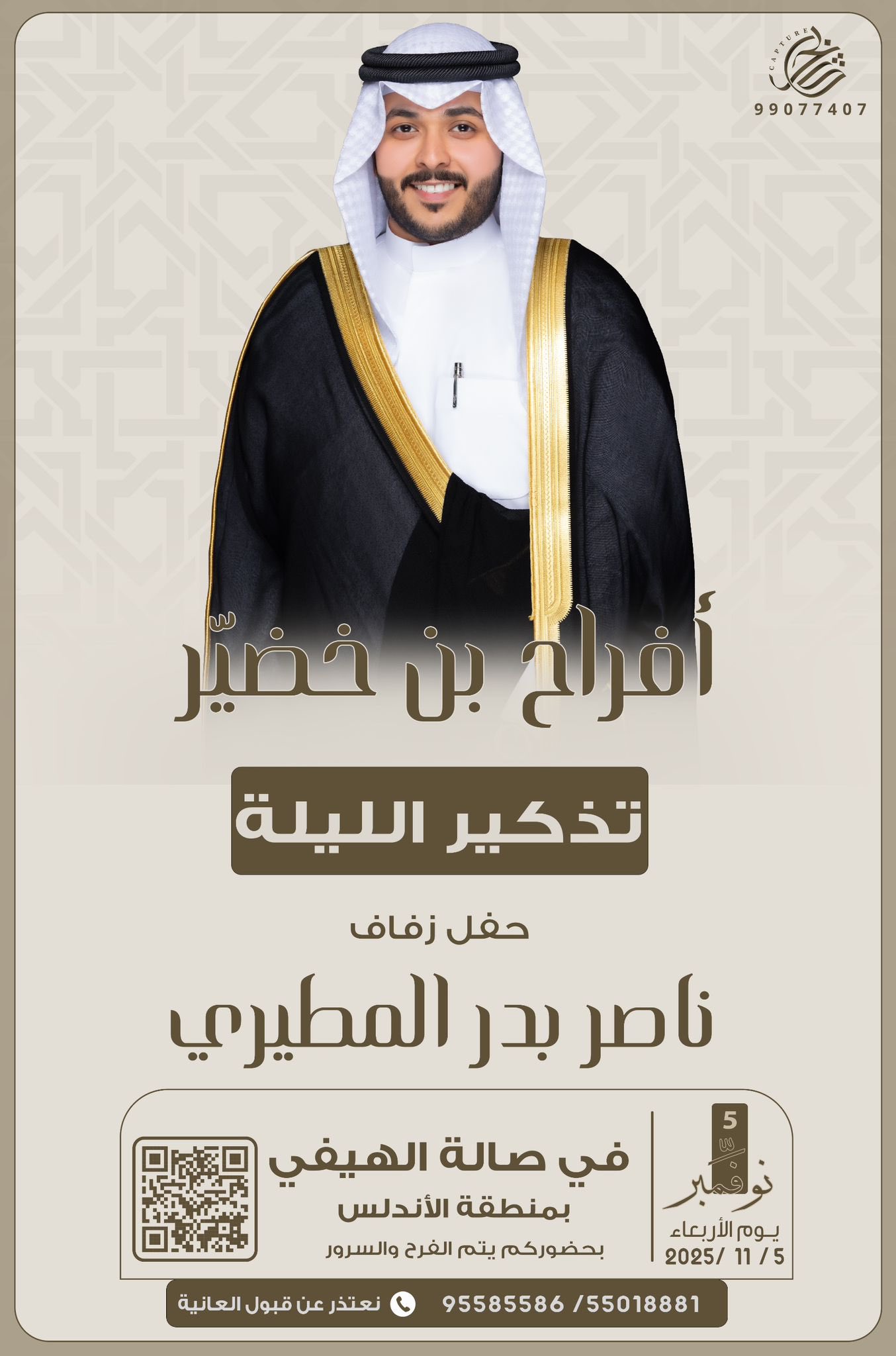 يتشرف :خليفة دهيسان ضيدان بوشيبة واخوانهبدعوتكم لحضور حفل زواج ابنهم : " مشعل " وذلك…