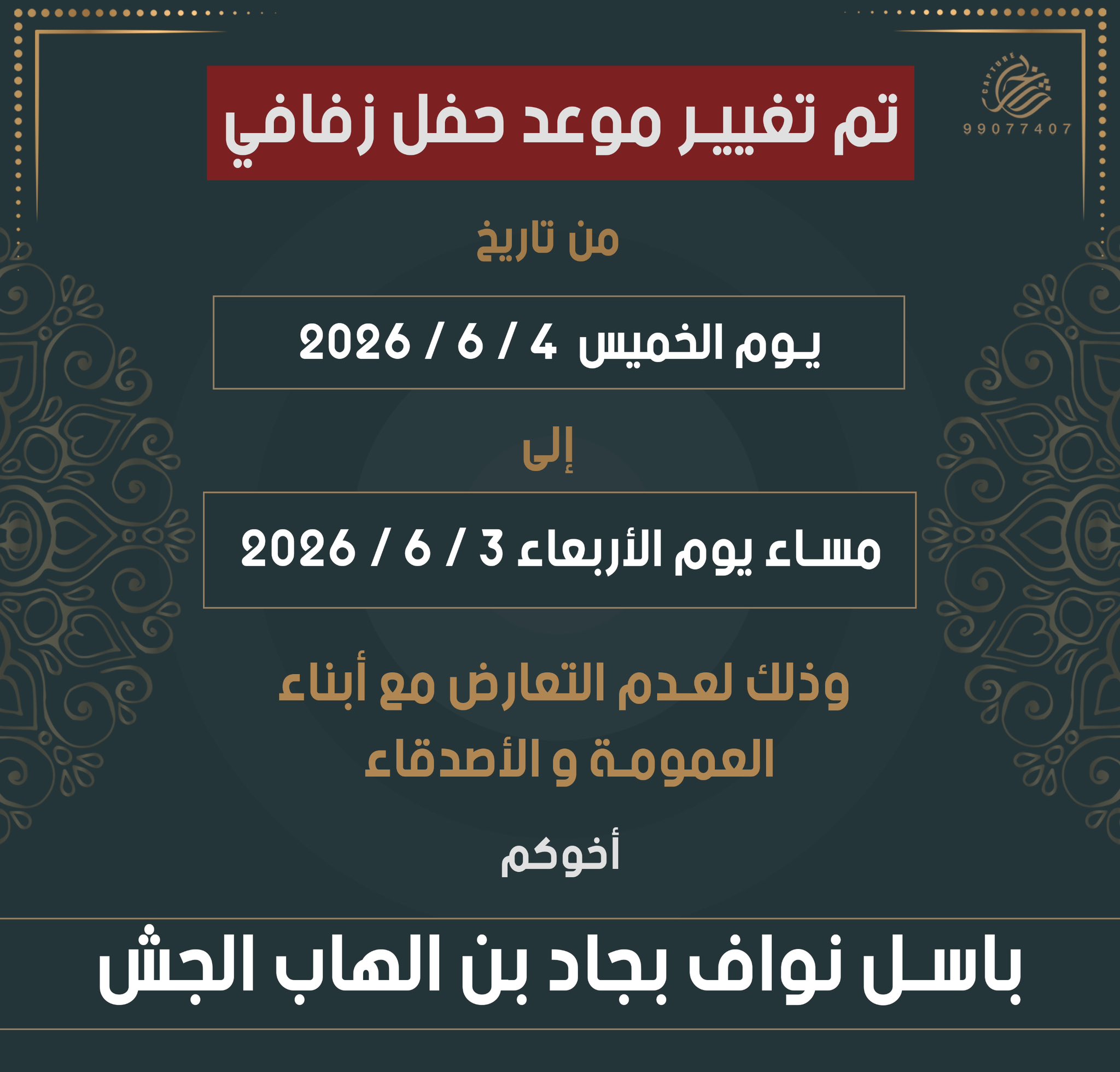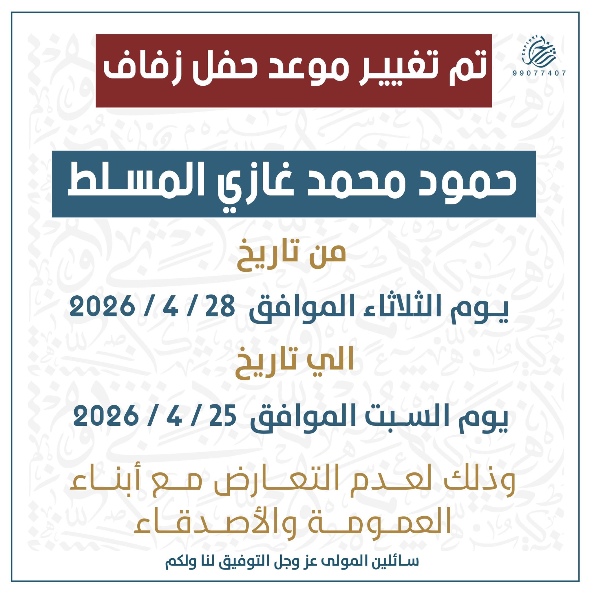 بعد التوكل على اللهتم تحديد حفل زفافي بمشيئة الله تعالى يوم الاربعاءالموافق 3/6/2026 اسأل…