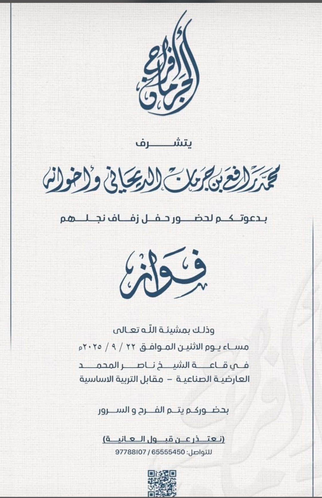 أتشرف بدعوتكم لحضور حفل زفاف يوم الثلاثاء 23 / 9 / 2025في صالة الشيخ ناصر…