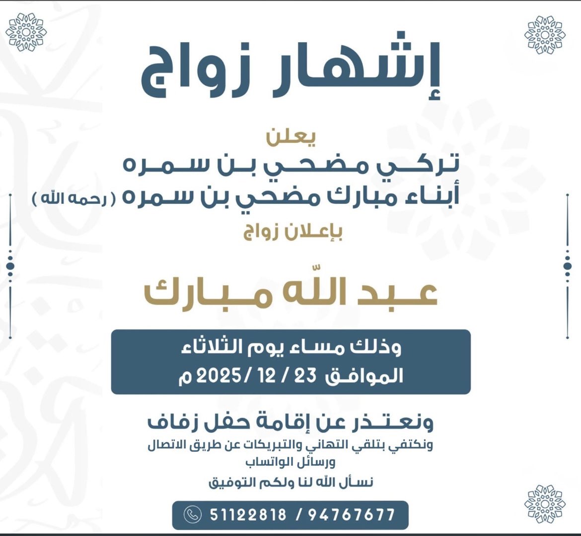 الحمدلله الذي تتم بنعمته الصالحاتتم بحمد الله عقد قران :( مطلق مرزوق بن ردعان الصهيبي…