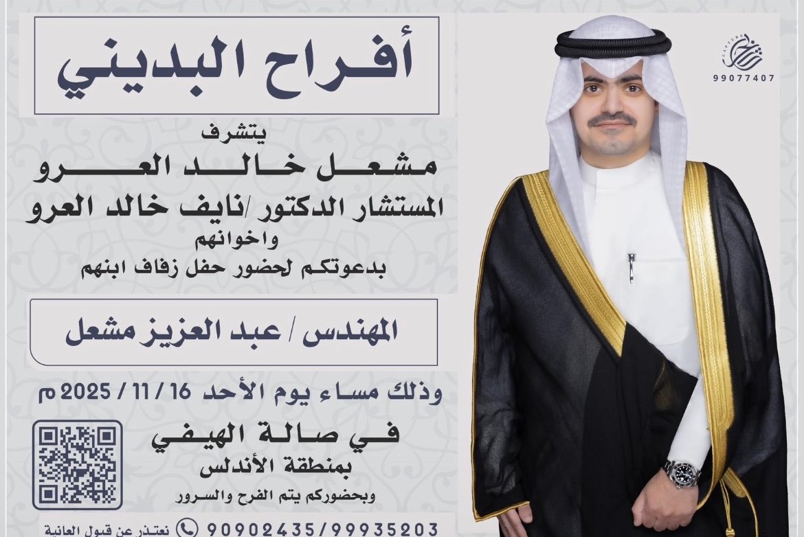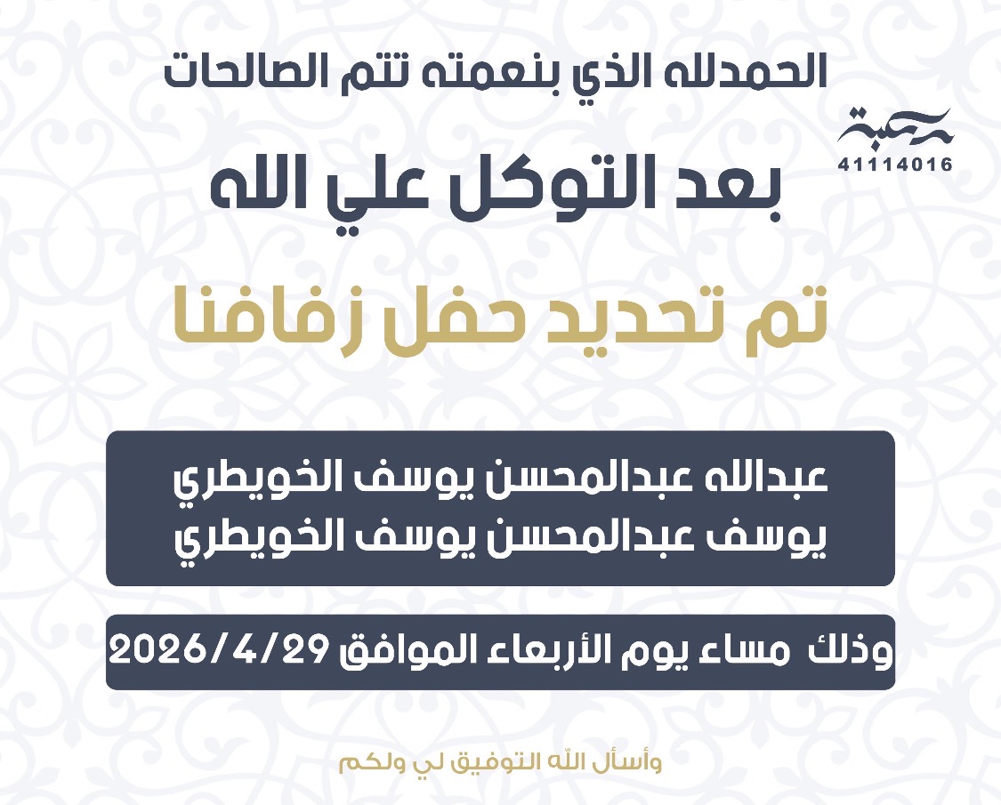 أفراح الحريبي يتشرف سعد بطي زويد الحريبي وإخوانه بدعوتكم لحضور حفل زفاف ابنهم عبد العزيز…