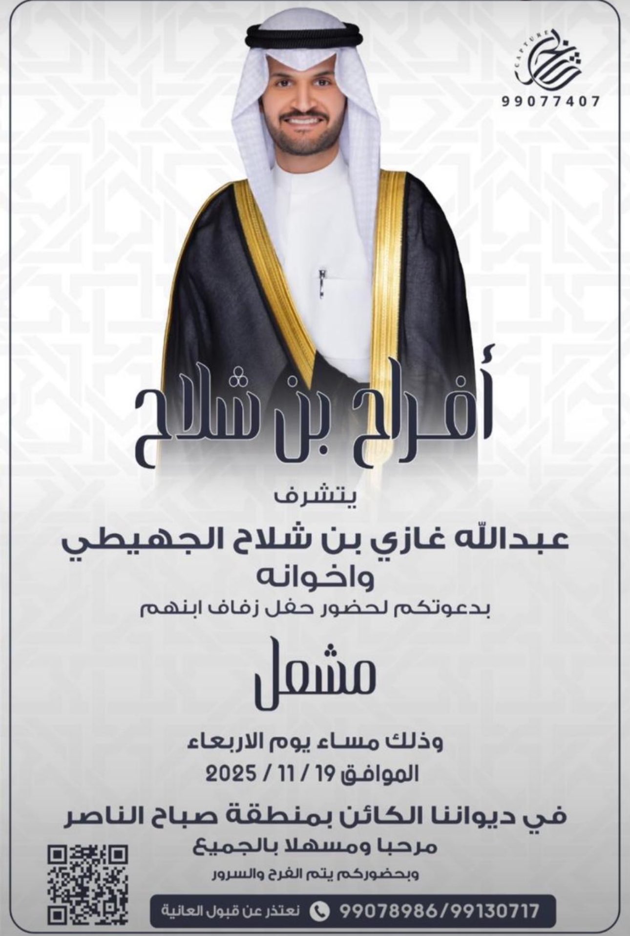 أفراح بن شلاح يتشرف :عبدالله غازي بن شلاح الجهيطي المطيري واخوانهبدعوتكم لحضور حفل زفاف ابنهم…