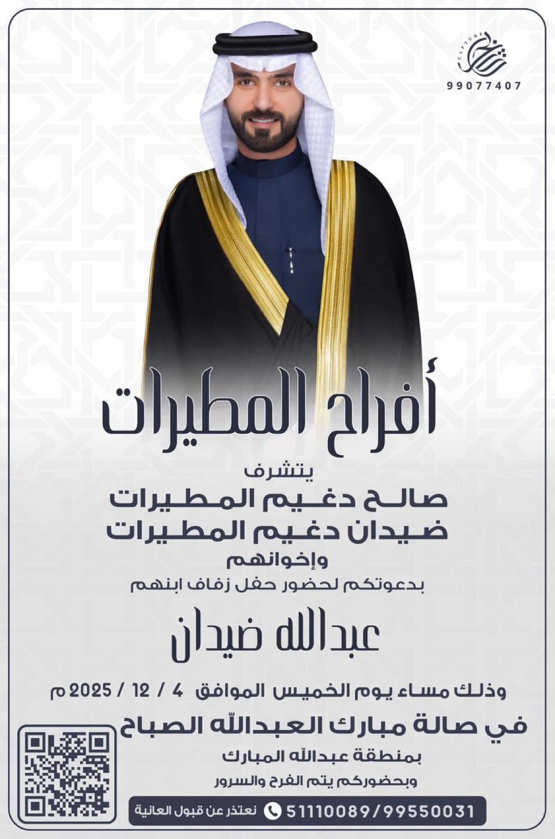 أفراح المطيرات يتشرف :صالح دغيم المطيرات المطيريضيدان دغيم المطيرات المطيري وإخوانهمبدعوتكم لحضور حفل زفاف ابنهم…