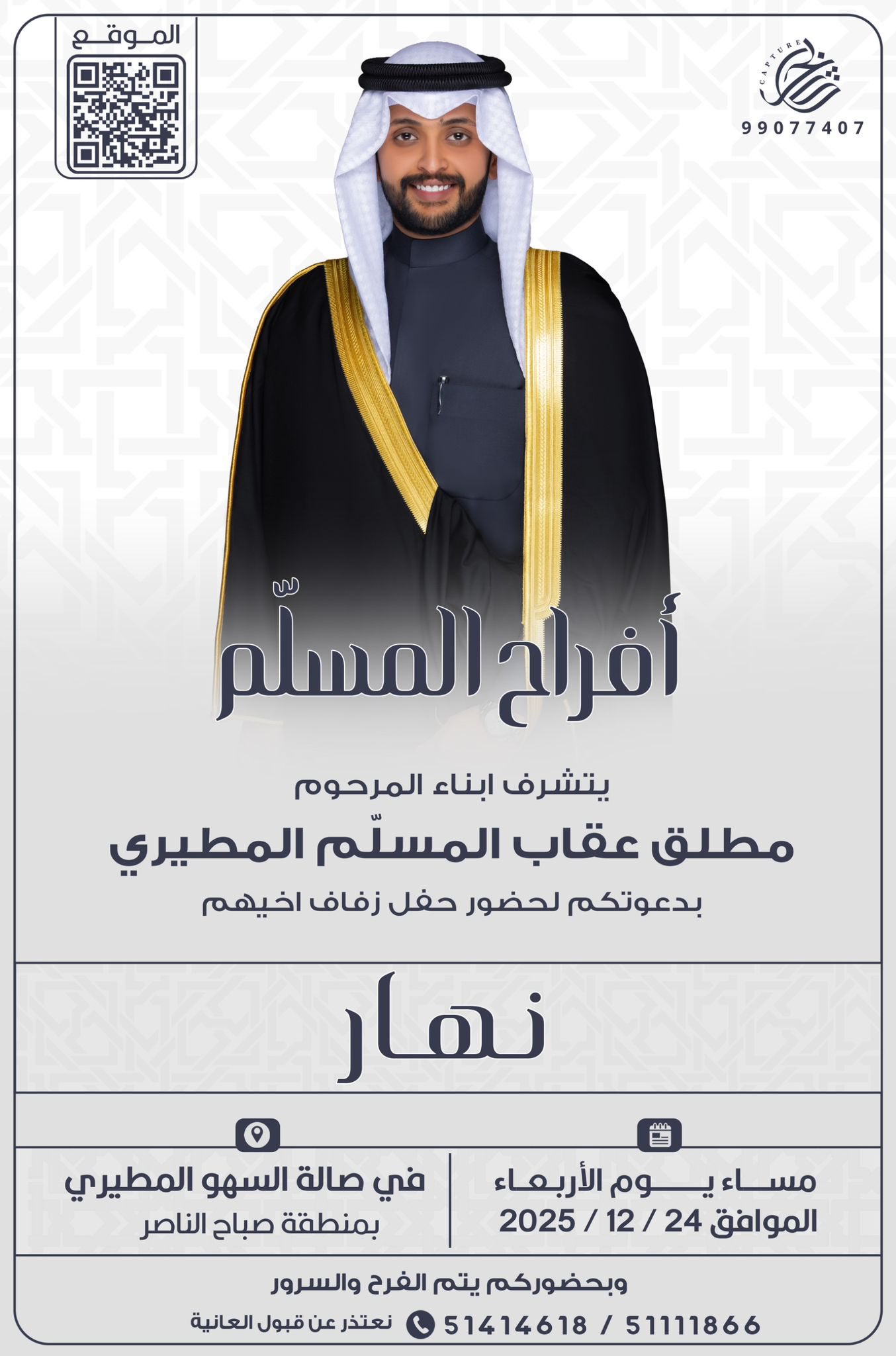 افراح المريري يتشرف :ناصر سعد طحيشل المريري المطيريبدعوتكم لحضور حفل زفاف نجله : ( سلطان…