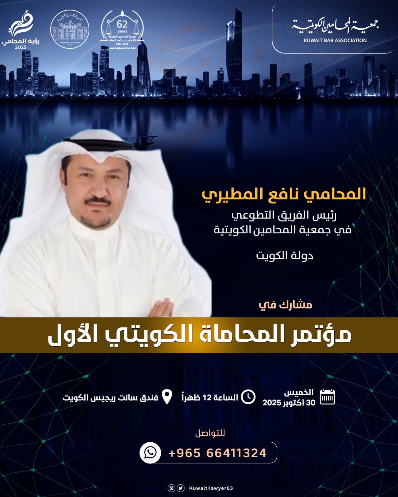 المحامي / صقر غازي المطيريدولة الكويت مشارك في مؤتمر المحاماة الكويتي الأول يوم الخميس 30…