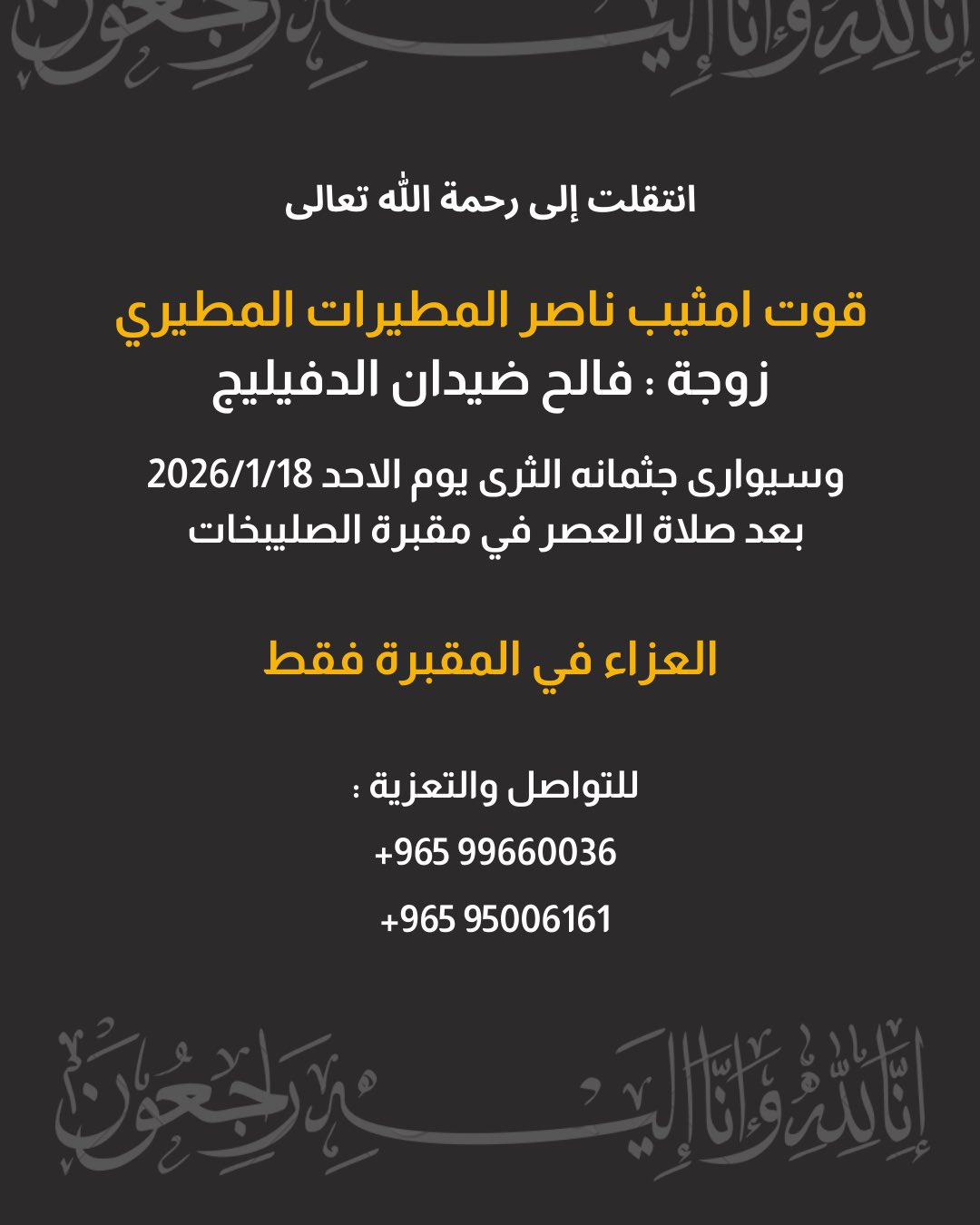 انتقل الى رحمة الله تعالى ( باتل دغش الصلابه ) وسيوارى جثمانه الثرىاليوم الخميس 2026/1/1بعد…