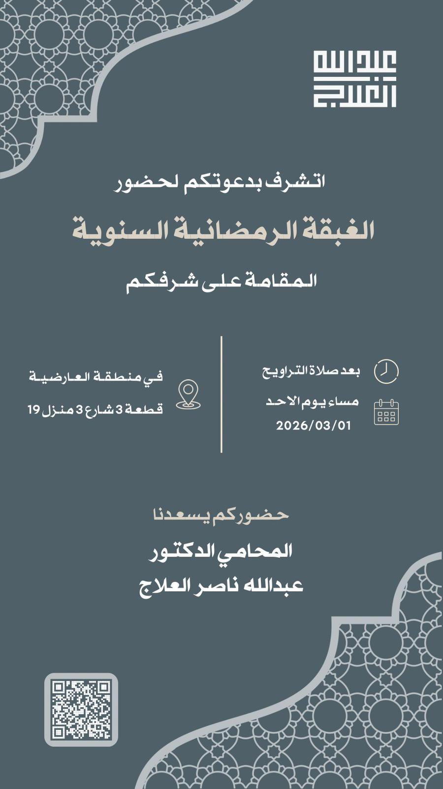 الغبقة الرمضانية يتشرف الدكتور :عبدالله ناصر العلاجبدعوتكم لحضور الغبقة الرمضانية مساء يوم الاحد الموافق 2026/3/1بعد…
