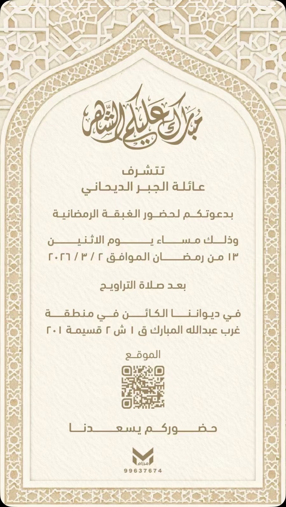 تتشرف عائلة الجبر الديحاني بدعوتكم لحضور الغبقة الرمضانية وذلك مساء يوم الاثنين ١٣ من…