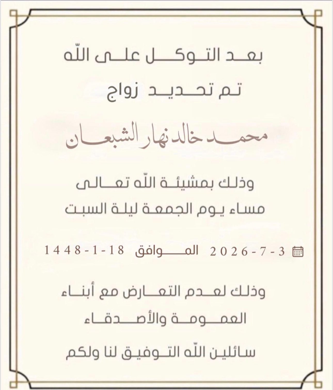 بعد التوكل على اللهتم بحمد الله وفضله تحديد حفل زفاف ابن العم : ( محمد…