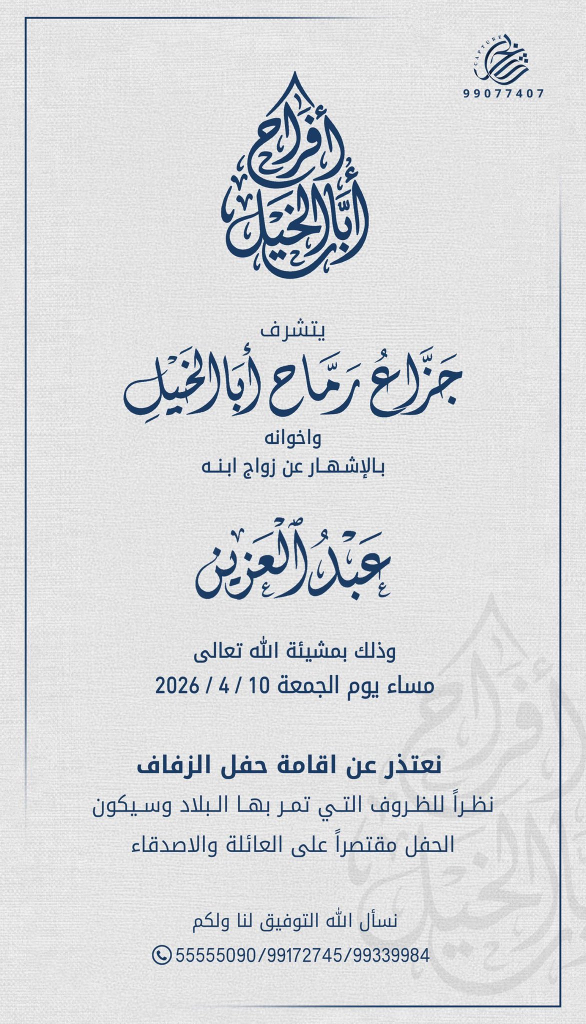 أفراح الميموني "يتشرف"خالد سعود ضاوي الميموني"وإخوانه"بدعوتكم لحضور حفل زفاف "ابنه" "وليد" وذلك مساء يوم الأربعاءالموافق…