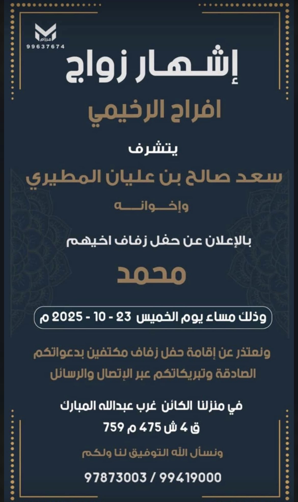 أفراح المتلع يتشرف أبناء المرحوم /شريد حزام المتلع البريعصي المطيريبدعوتكم لحضور حفل زفاف إبنهم :…