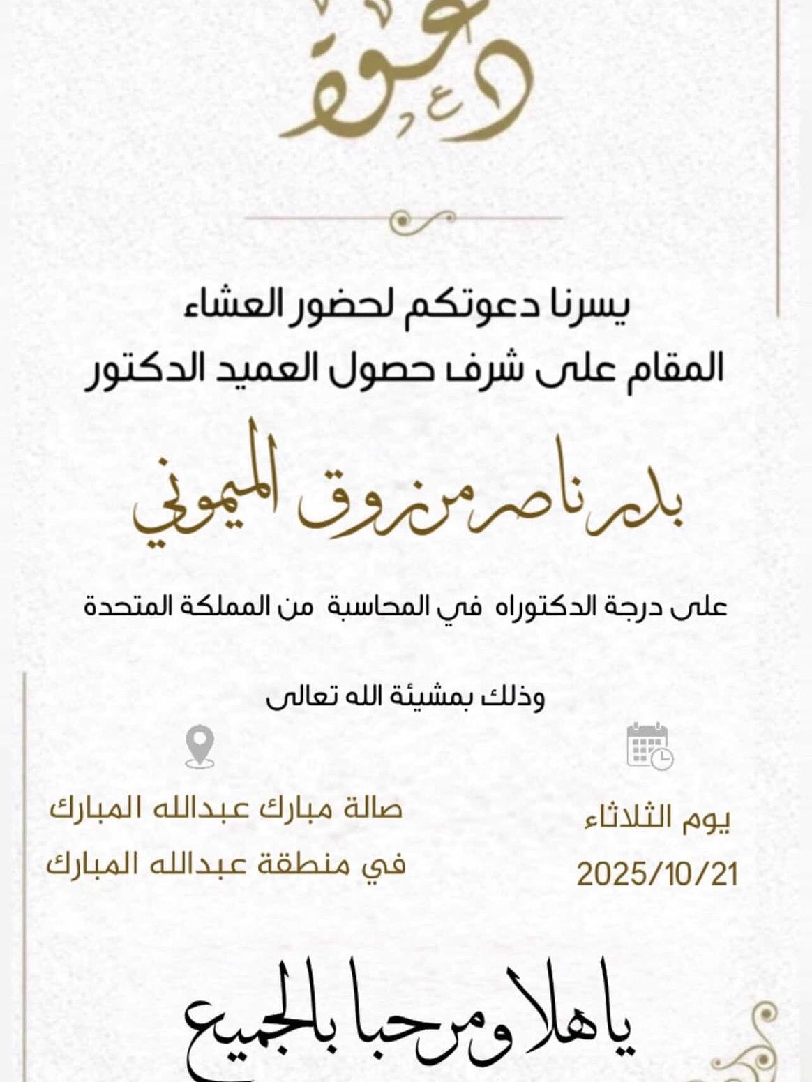 اتشرف بدعوتكم لحضور حفل زفاف فيصل | علي وذلك مساء يوم الثلاثاءالموافق 21 / 10…