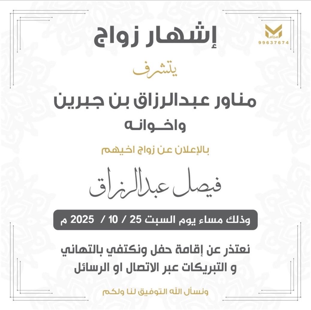 اشهار زواج يتشرف :مناور عبدالرزاق بن جبرين و اخوانهبالاعلان عن حفل زفاف اخيهم : (…