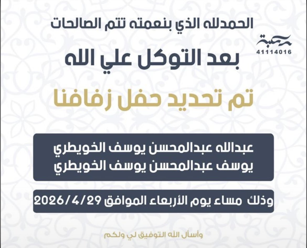 أفراح الرخيمي يتشرف :عبدالله طلق سعود المطيريعبدالرحمن عبدالله طلق المطيريبدعوتكم لحضور حفل زفاف ابنهم :…