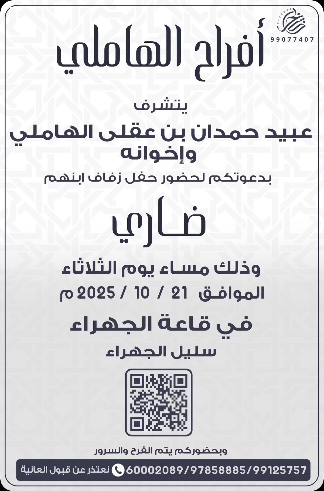 أفراح السريحي يتشرف :محمد هجاج السريحي الملعبي المطيري وإخوانهبدعوتكم لحضور حفل زفاف ابنهم : (…