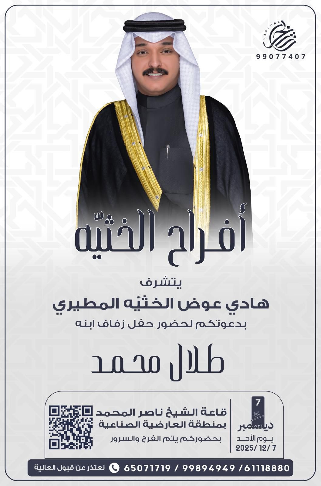 أفراح الخثيّه يتشرف :هادي عوض الخثيّه المطيريبدعوتكم لحضور حفل زفاف ابنه : ( طلال محمد…