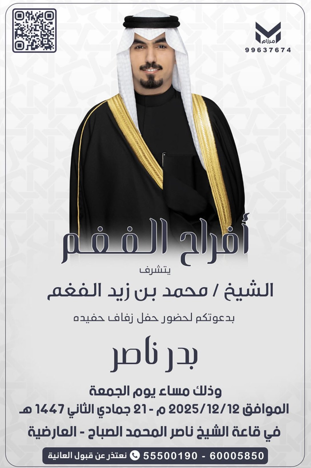 أفراح الفغم يتشرفالشيخ : محمد بن زيد الفغمبدعوتكم لحضور حفل زفاف حفيده : ( بدر…