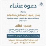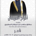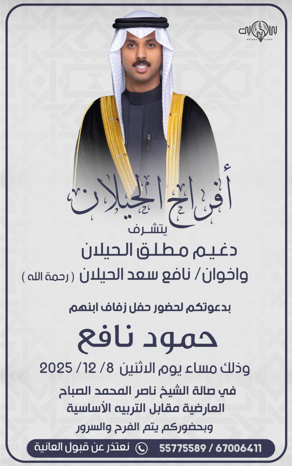 يتشرففالح حمود مطر العيباني الميمونيواخوانهبدعوتكم لحضور حفل زفاف ابنهمخالد عقابمساء يوم الجمعه2025/12/5