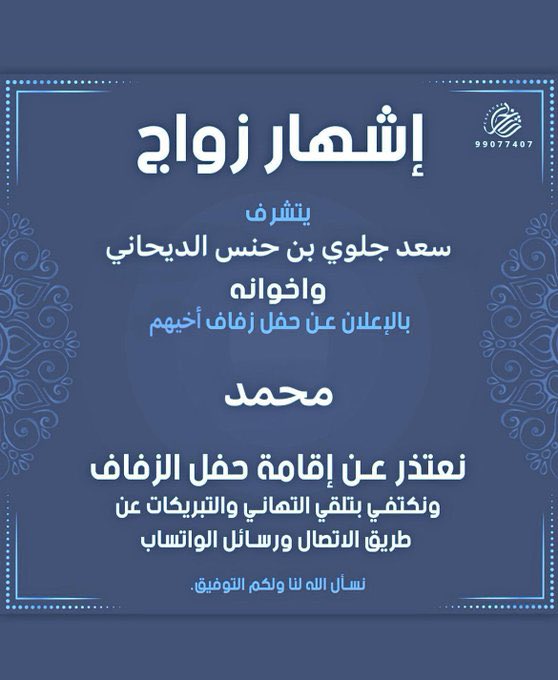 أفراح الميموني "يتشرف"فلاح مناور حسين المطيريحسين مناور حسين المطيري واخوانهمبدعوتكم لحضور حفل زفاف ابنهم …