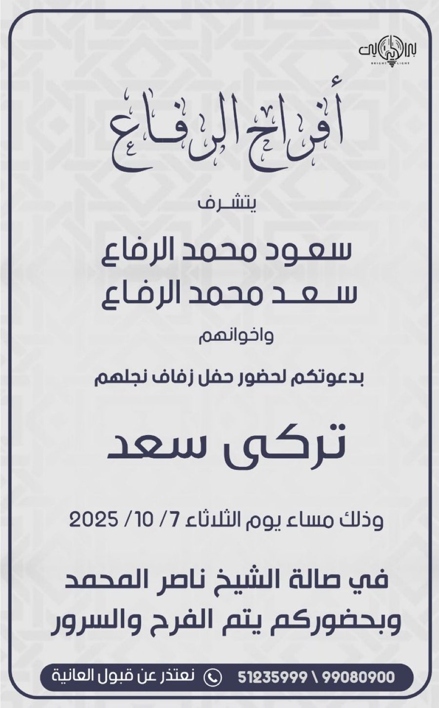 اتشرف بدعوتكم لحضور حفل زفافيوذلك مساء يوم الاربعاءالموافق 8 / 10 / 2025•في صاله سهو…