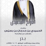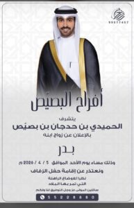 أفراح التوم يتشرف :سعد سرور التوم المطيريفيحان سرور التوم المطيري واخوانهمبدعوتكم لحضور حفل زفاف ابنهم…