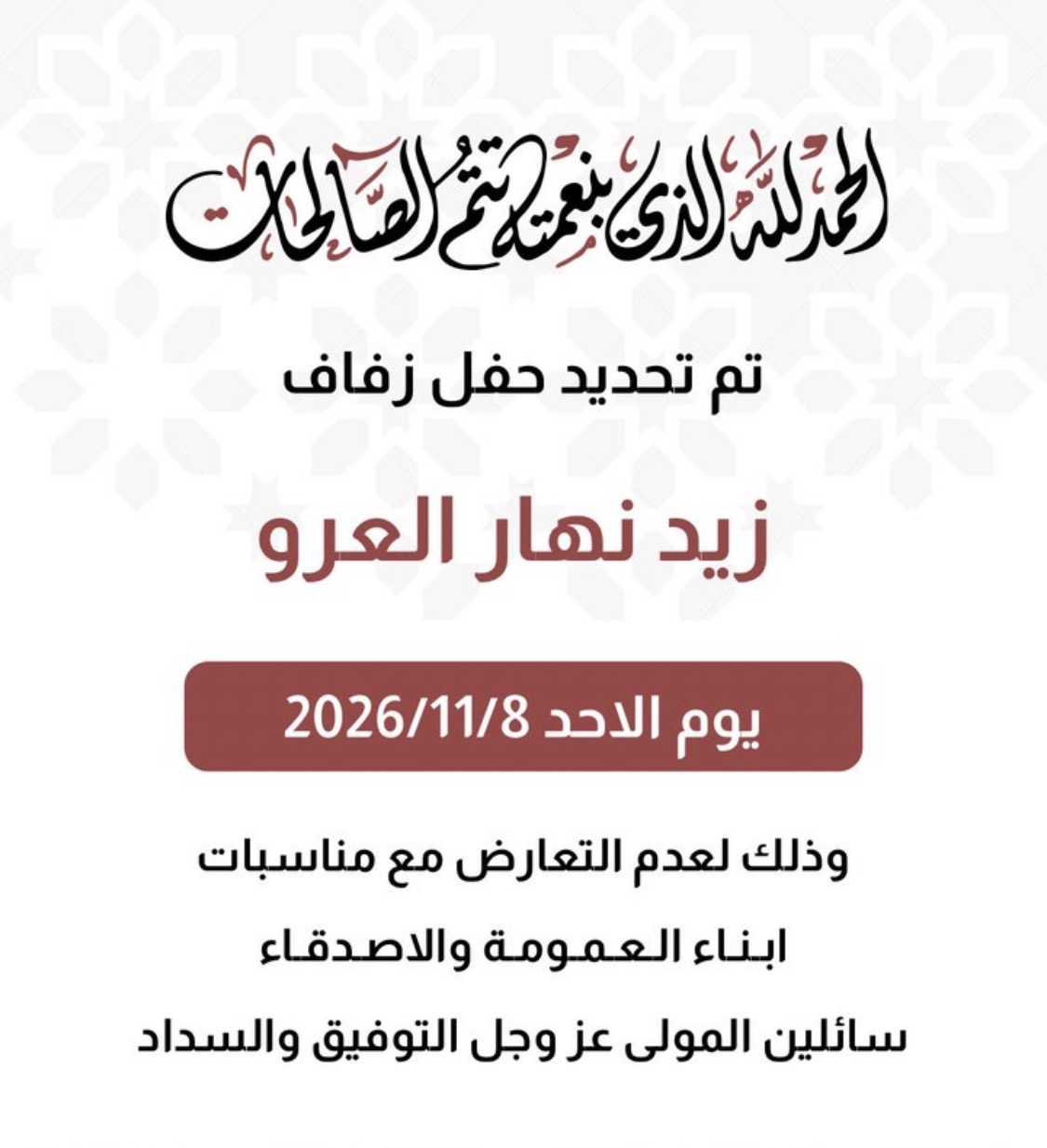 الحمدلله الذي تتم بنعمته الصالحات تم بحمد الله عقد قران :عبدالعزيز سند فالح بن خضيّر…